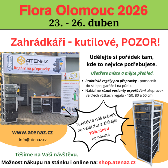 Ve dnech 23. – 27. dubna 2025 jsme se zúčastnili jarní etapy výstavy Flora Olomouc 2025, která patří mezi nejvýznamnější zahradnické a pěstitelské akce v České republice. Naši expozici jsme zaměřili na praktické a designově promyšlené regály na přepravky, které představují ideální řešení pro organizaci...